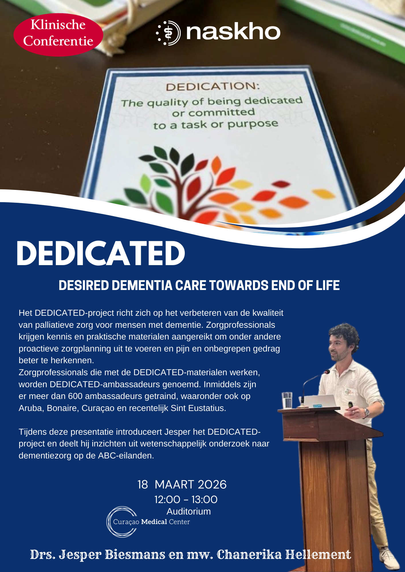 Drs. Jesper Biesmans en mw. Chanerika Hellement zullen op 18 maart het wetenschappelijke project DEDICATED (Desired Dementia Care Towards End of Life) presenteren bij Curaçao Medical Center.